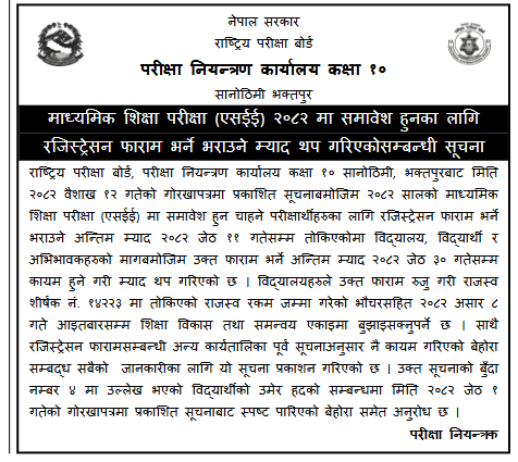 तर विद्यालय, विद्यार्थी तथा अभिभावकहरूबाट आएको मागको सम्बोधनस्वरूप उक्त म्यादलाई जेठ ३० गतेसम्म कायम हुने गरी थप गरिएको छ। यस अन्तर्गत विद्यालयहरूले विद्यार्थीको फाराम संकलन गरी तोकिएको शुल्क बुझाएर प्राप्त भौचरसहित असार ८ गते आइतबारसम्म सम्बन्धित शिक्षा विकास तथा समन्वय एकाइमा पेश गर्नु पर्नेछ।