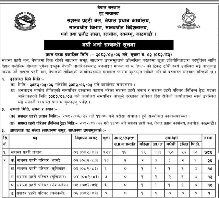 सशस्त्र प्रहरी बल मानव स्रोत विभागले शुक्रबार सूचना जारी गर्दै सशस्त्र प्रहरी जवान, भान्से, कुचीकार, सूचीकार, केशकर्तक र कचर्मकर्मी पदका लागि दरखास्त आह्वान गरेको हो ।