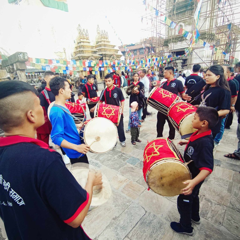 काठमाडौं – नागार्जुन नगरपालिका ६ टौखेल हाईट बलामी गुथी समाजद्वारा प्रशिक्षित धिमे: तथा बाँसुरी बाँजा टोलीले स्वयम्भू परिक्रमा गरी गुँला